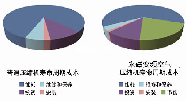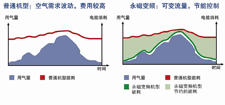 永磁變頻空壓機可以精確的滿足用戶的空氣需求。當用戶的用氣量降低時,排氣量相應地減少,同時能耗也按比例下降。通過先進的變頻技術,大大的減少了空壓機的卸載,使能耗大大下降。永磁變頻空壓機可跟蹤空氣需求量的變化自動調節(jié)電機轉速,平均節(jié)能可達50%。